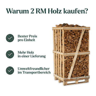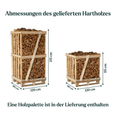 Das Brennholz wird verpackt und vor Feuchtigkeit geschützt, gestapelt auf einer Palette versandt. 1 RM (Raummeter) entspricht etwa 0,7 m3. Die Palette wird nicht zurückgegeben - sie ist im Lieferpreis inbegriffen und Sie können das Holz darauf einfach in Ihren Holzschuppen fahren.