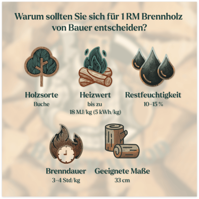 Das gespaltene Holz hat dank der Kammertrocknung eine Restfeuchtigkeit von ca. 10%, was einen hohen Heizwert und sofortige Einsetzbarkeit gewährleistet. Der gleichmäßige Schnitt und die hohe Holzdichte sorgen für ein stabiles Brennen ohne häufiges Nachlegen.