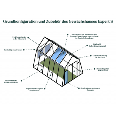 Im Lieferumfang sind zusätzlich ein automatischer Fensteröffner für jedes Dachfenster, Haken zum Binden von Pflanzen, beidseitige Regenrinne und Halterungen für eigene Regalbretter.
