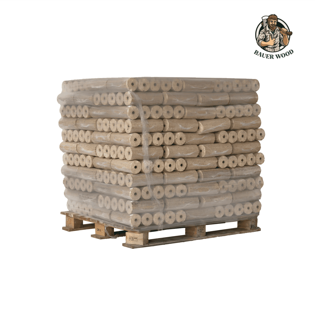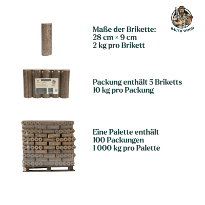Wir versenden die Holzbriketts verpackt in luftdichten 10kg-Paketen auf einer Palette. 1 Palette enthält insgesamt 1.000 kg (100 Pakete) Brennstoff – in jedem Paket befinden sich 5 Briketts. Die Palette muss nicht zurückgegeben werden, sie ist im Lieferpreis inbegriffen.