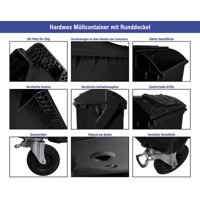 Mehr lesenSchwarzer Müllcontainer 1100 l von Hardwex mit abgerundetem Schiebedeckel in Grün und Einwurfloch für bis zu 440 kg Buntglas, geeignet für Mietshäuser, Gemeinden und Unternehmen. Er ist witterungsbeständig, bruchsicher, leicht zu reinigen und einfach zu handhaben.