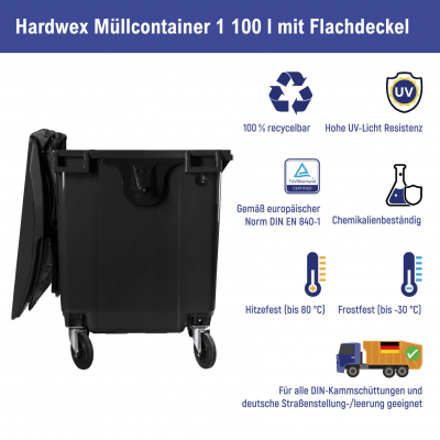 Mehr lesenSchwarzer Müllcontainer 1100 l von Hardwex mit orangenem Flachdeckel für bis zu 440 kg Karton/Wertstoffe, geeignet für Mietshäuser, Gemeinden und Unternehmen. Er ist witterungsbeständig, bruchsicher, leicht zu reinigen und einfach zu handhaben.