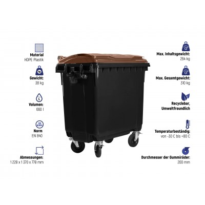 Mehr lesenSchwarzer Müllcontainer 660 l von Hardwex mit braunem Flachdeckel für bis zu 264 kg Biomüll, geeignet für Mietshäuser, Gemeinden und Unternehmen. Er ist witterungsbeständig, bruchsicher, leicht zu reinigen und einfach zu handhaben.