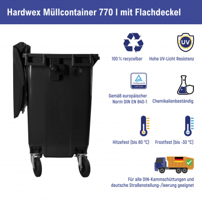 Mehr lesenMüllcontainer 770 l von Hardwex in Gelb mit Flachdeckel für bis zu 308 kg Plastikabfall, geeignet für Mietshäuser, Gemeinden und Unternehmen. Er ist witterungsbeständig, bruchsicher, leicht zu reinigen und einfach zu handhaben.