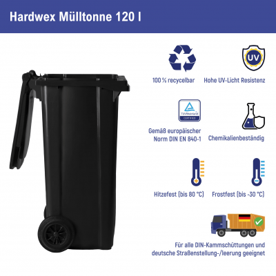 Mehr lesenMülltonne 120 l von Hardwex in Schwarz mit rotem Deckel für bis zu 48 kg Elektroschrott/Wertstoffe, geeignet für ein Einfamilien- und Ferienhäuser oder Unternehmen. Sie ist witterungsbeständig, bruchsicher, leicht zu reinigen und einfach zu handhaben.