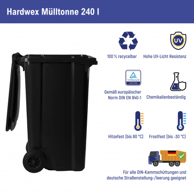 Mülltonne 240 l von Hardwex in Grün für bis zu 96 kg Buntglas, geeignet für Ein- und Mehrfamilienhäuser, Gemeinden und Unternehmen. Sie ist witterungsbeständig, bruchsicher, leicht zu reinigen und einfach zu handhaben.