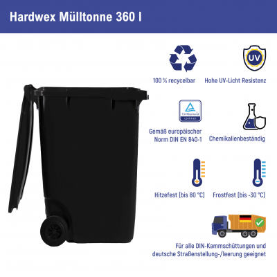 Mehr lesenMülltonne 360 l von Hardwex in Schwarz für bis zu 144 kg Restmüll, geeignet für Mietshäuser, Gemeinden und Unternehmen. Sie ist witterungsbeständig, bruchsicher, leicht zu reinigen und einfach zu handhaben.