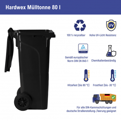 Mehr lesenMülltonne 80 l von Hardwex in Grün für bis zu 33 kg Buntglas, geeignet für ein Einfamilien- und Ferienhäuser oder Unternehmen. Sie ist witterungsbeständig, bruchsicher, leicht zu reinigen und einfach zu handhaben.